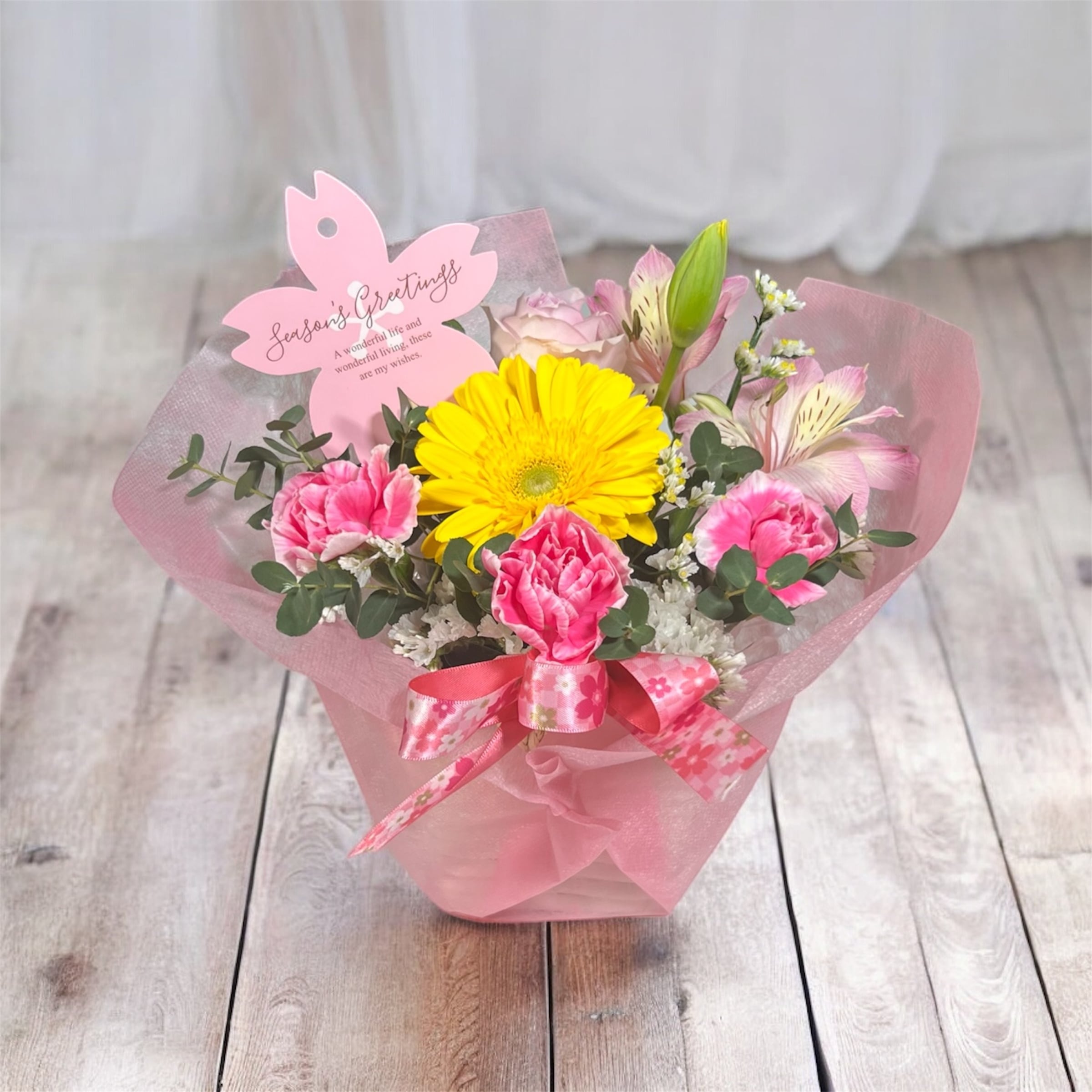 春の訪れを感じさせる明るいピンクと黄色の花々が見事にアレンジされたこのアイテムは、大切な方への特別なお祝いにぴったりです。