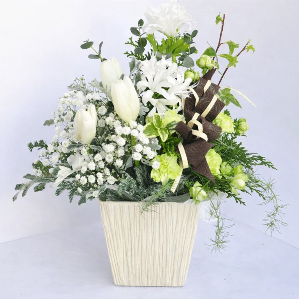 シンプルでナチュラルなホワイトにグリーンを多数入れ優しい雰囲気でアレンジします。みずみずしいグリーンの香りと上品な組み合わせお楽しみ下さい。